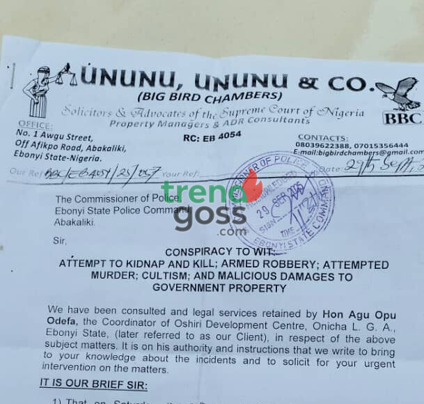 The Coordinator of Oshiri Development Centre in Onicha Local Government Area of Ebonyi State, Hon. Agu Opu Odefa, has petitioned the Commissioner of Police following what he described as a violent assassination attempt on his life by suspected cultists.