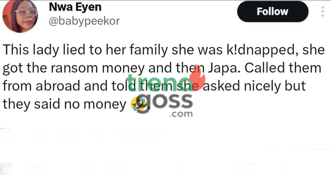 According to a post by @babypeekor, the lady told her family she had been kidnapped and demanded ransom for her release. Out of fear and panic, her relatives quickly gathered the money to “rescue” her. But instead of returning home, she allegedly used the funds to process her travel and “Japa” overseas.