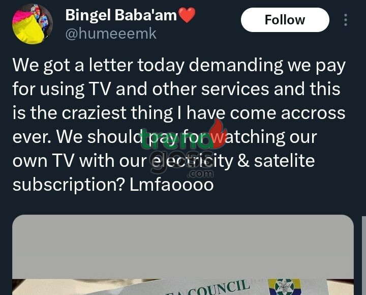 “We got a letter today demanding we pay for using TV and other services, and this is the craziest thing I have come across. We should pay for watching our own TV with our electricity and satellite subscription?”
