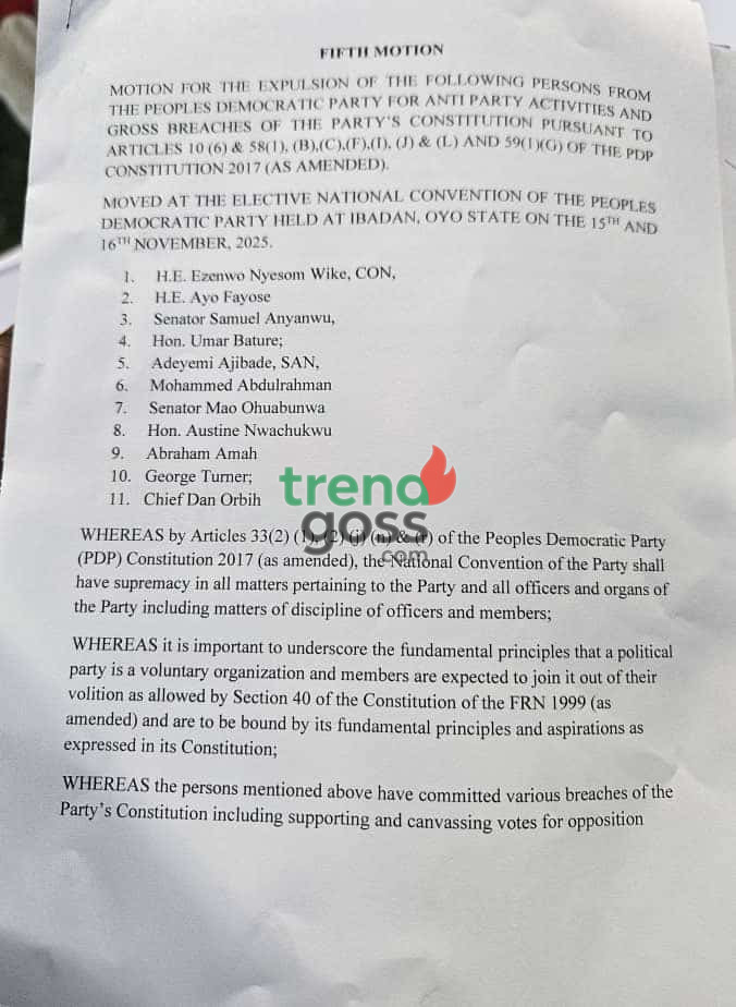 The Fifth Motion, presented during the party’s Elective National Convention in Ibadan on fifteenth and sixteenth November, lists a group of influential figures, including former governors, senators and senior party officials.