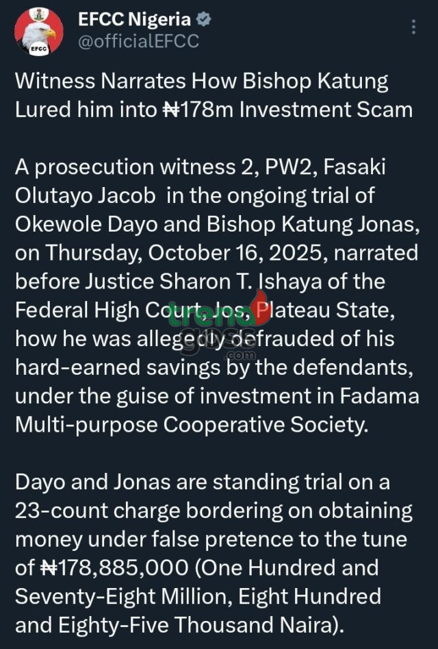 A retired civil servant, Mr. Fasaki Olutayo Jacob, on Thursday, 16 October 2025, told the Federal High Court in Jos, Plateau State, how he was allegedly deceived by Bishop Katung Jonas and his associate, Okewole Dayo, into investing in a fraudulent scheme that cost him ₦1.2 million.
